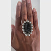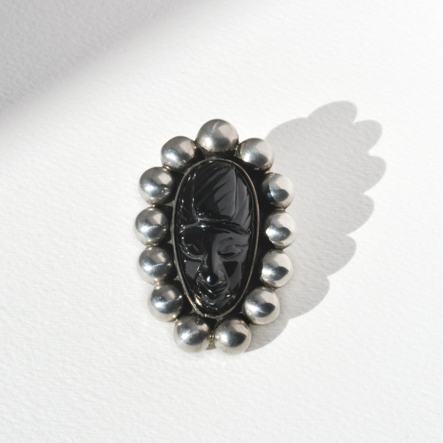 This compelling vintage brooch features a hand carved onyx face set within a frame of domed sterling silver beads. The portrait is highly dimensional, with sculpted features and a deep, polished surface that captures light in sharp, reflective planes. This piece was curated for its strong presence without feeling overly heavy, a wearable miniature sculpture that holds both character and craftsmanship.