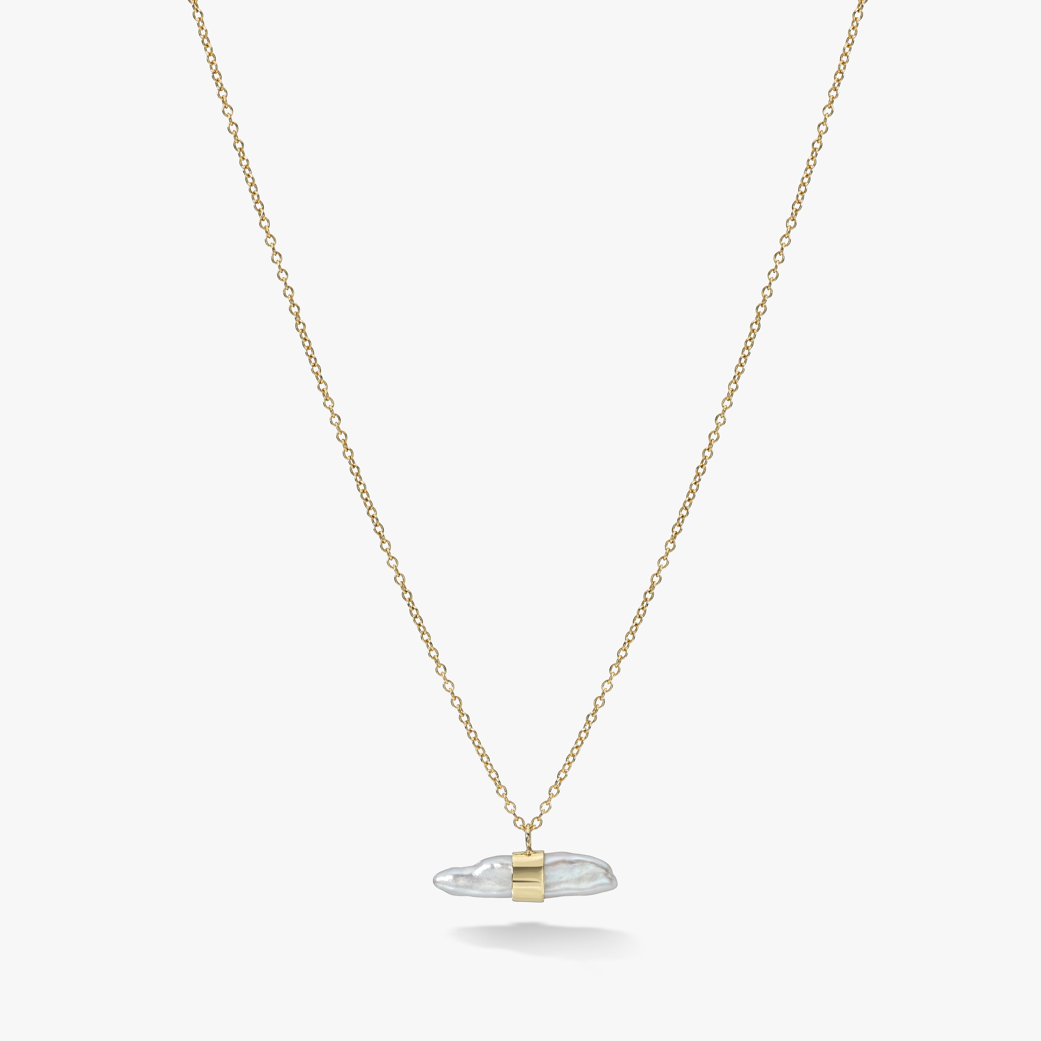 The White Space way with pearls will always be clean and modern, and always a celebration of the gem's unique and natural beauty. This piece combines a one-of-a-kind Lagniappe pearl—grown in the Tennessee River—with a 3mm-wide embrace of solid 14k yellow gold. We call this style Aalto, named for the mid-century style-defining Finnish architect Alvar Aalto.
