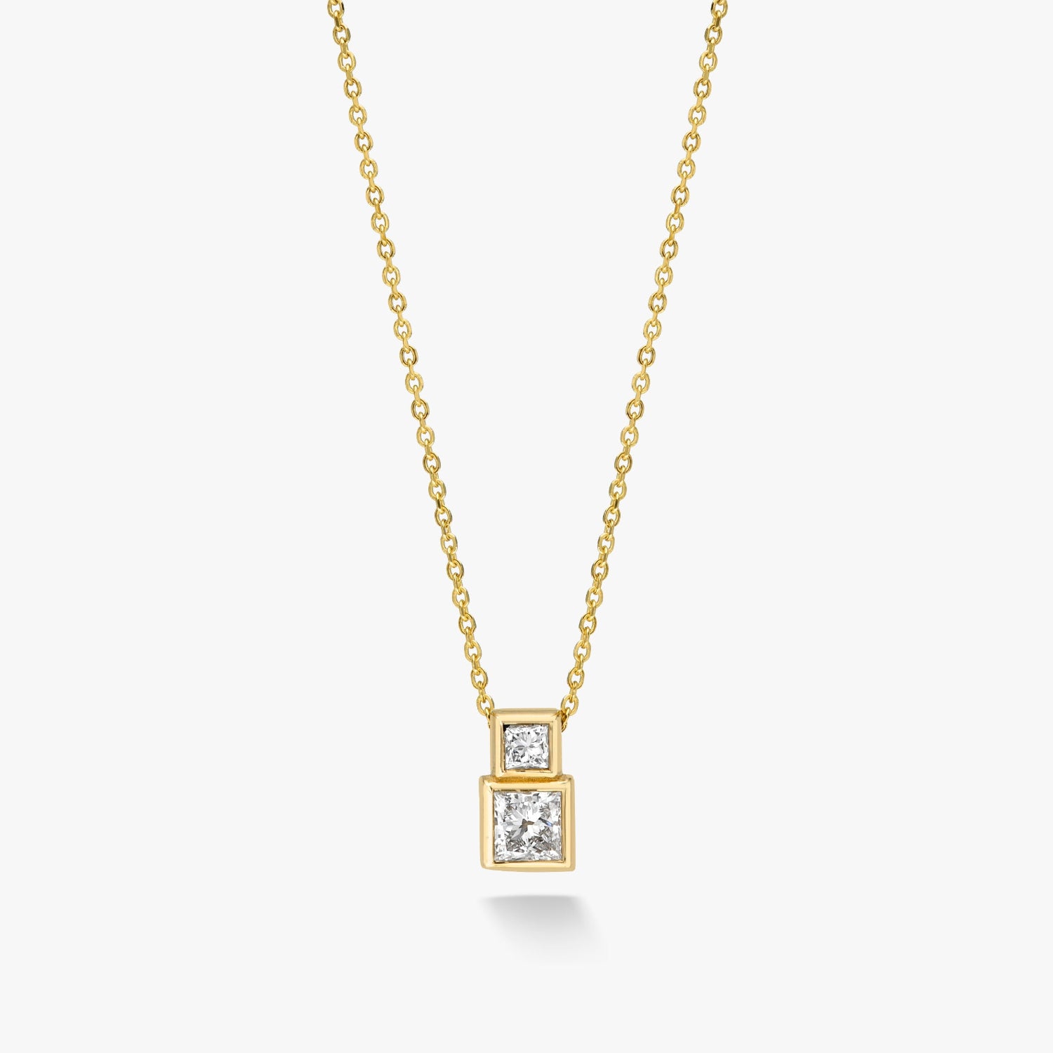 Suspended from a solid 14k gold diamond-cut chain, two lab-grown princess-cut diamonds rest in a sculptural composition of light and form. Balanced and enduring, the Bruta Necklace in diamond reflects strength refined to its essence. Luminous, architectural, timeless and designed to be worn effortlessly, it carries quiet elegance from day to evening. Also available with reclaimed natural diamonds.