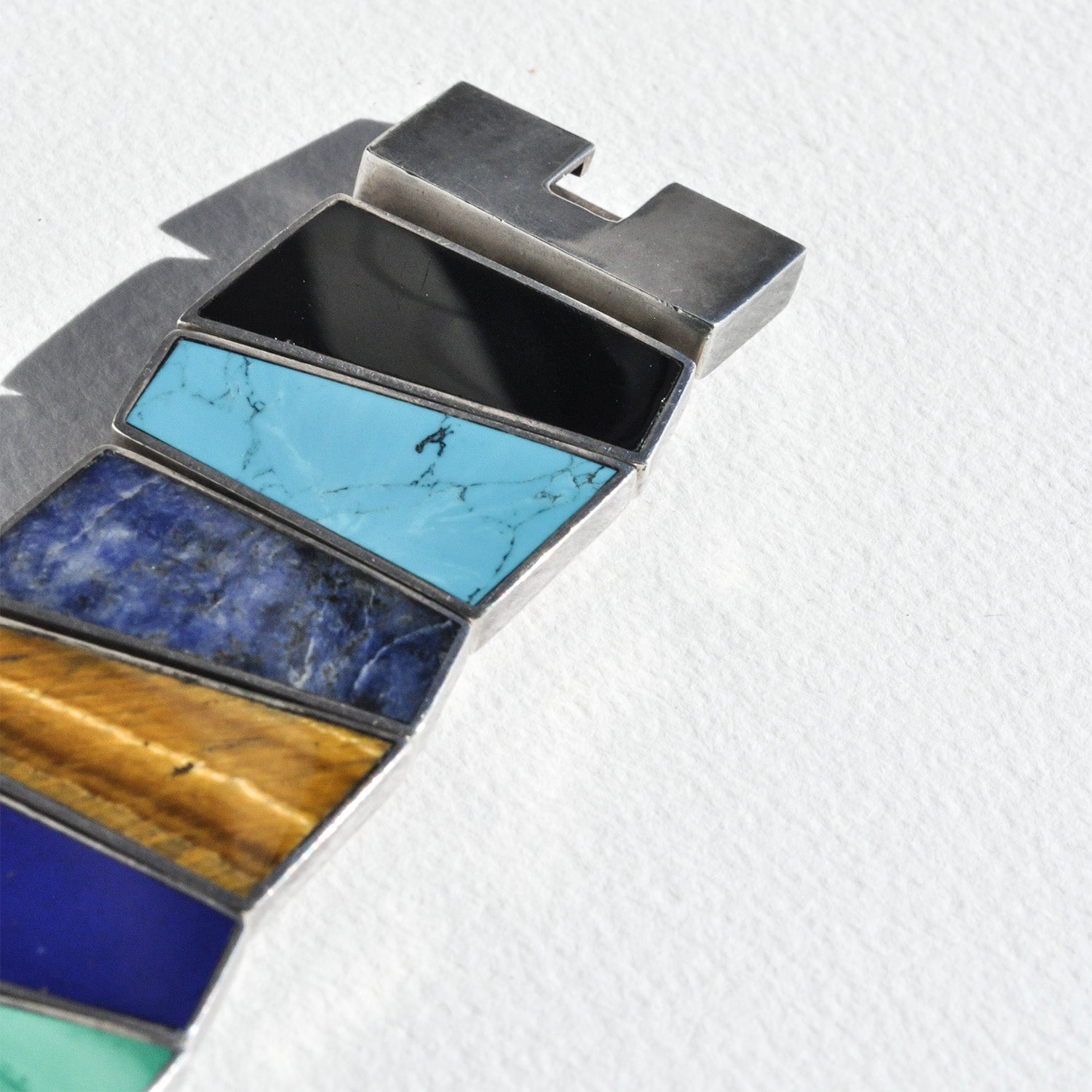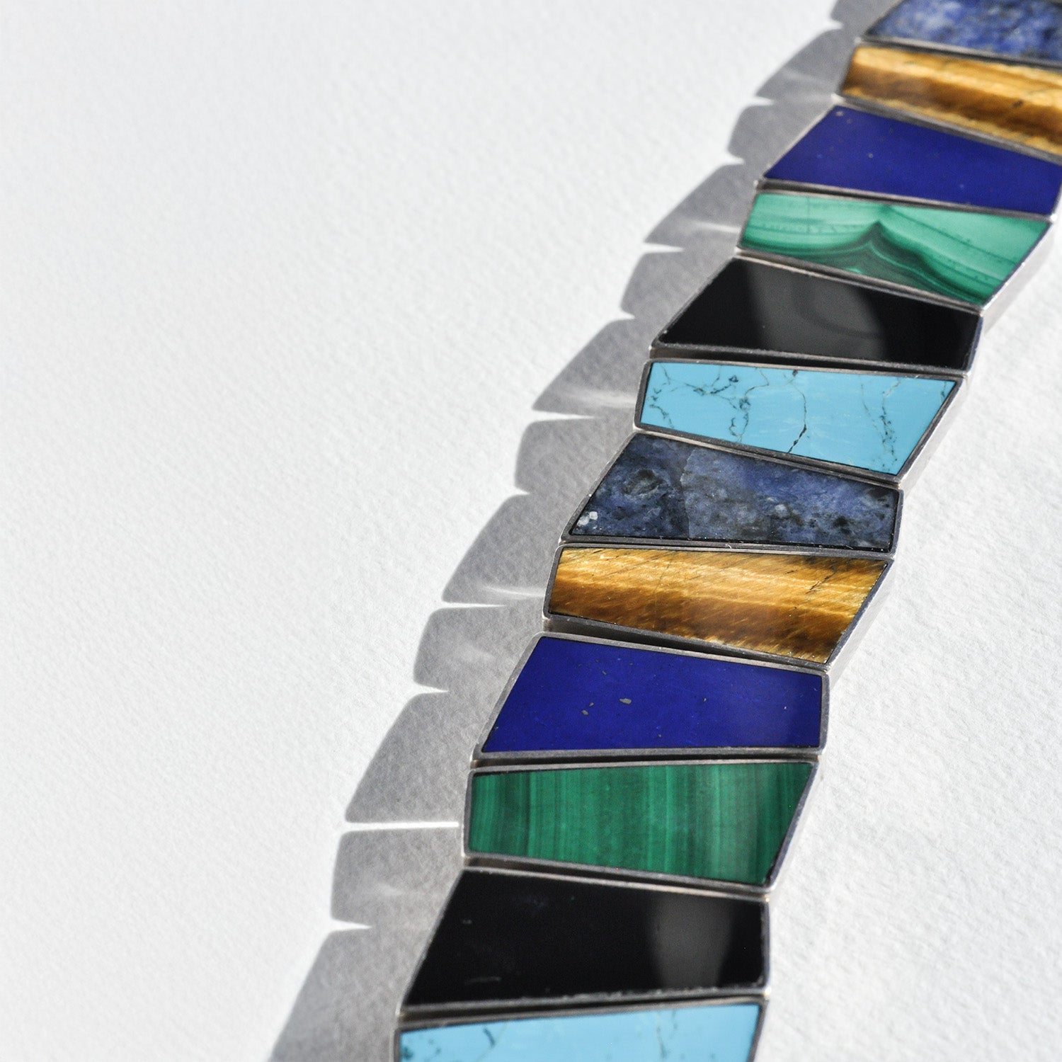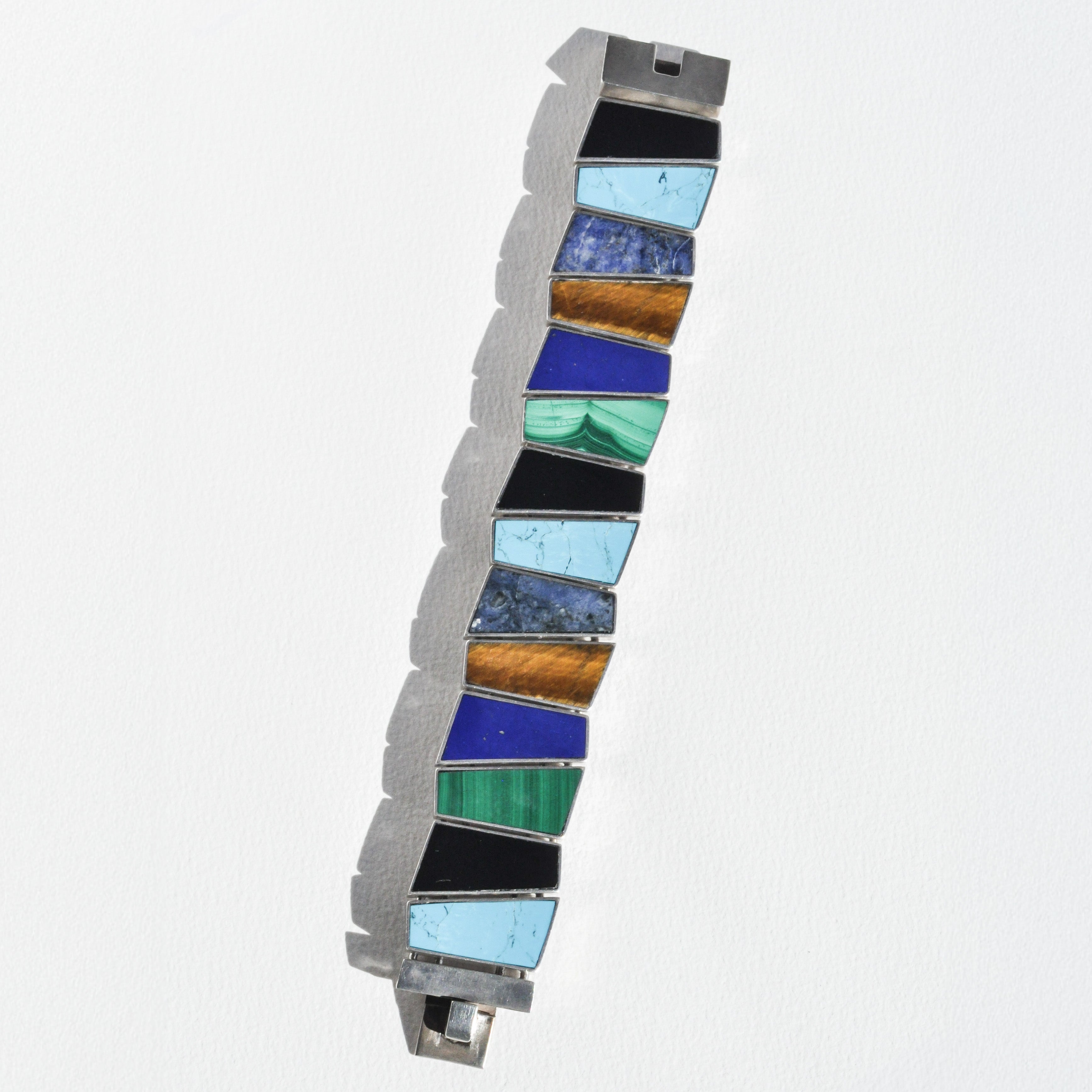 A bold, architectural vintage cuff built from multiple linked geometric sterling silver panels, each set with a hand cut inlaid stone: vivid turquoise, deep onyx, banded malachite, luminous lapis, and warm, shifting tiger’s eye. The angled silhouettes create a rhythmic, modernist composition sharp lines softened by the natural textures and colors of the stones.