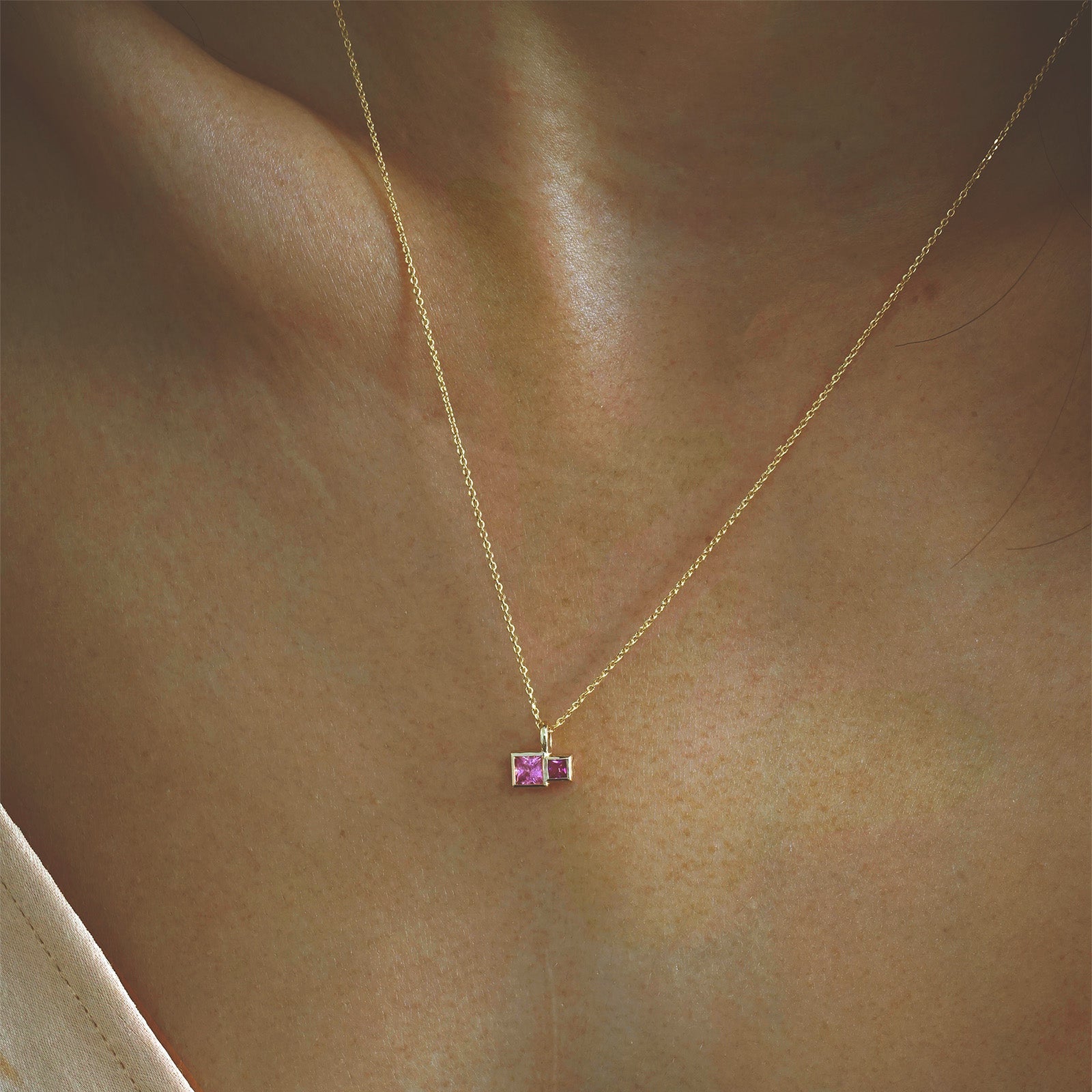 A special edition of our Blue Savoye Necklace. Yellow gold frames juicy pink sapphire in precise, architectural lines. The composition glows like light across glass — calm, dimensional, quietly expressive. Meant to draw the eye with quiet proportion, the Savoye Necklace brings color and clarity to everyday form. This style is also available with reclaimed white diamonds.
